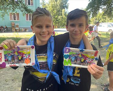 Nach einer schlaflosen Nacht im Schutzraum begann unser letzter Sommerlagertag. Nach dem Frühstück und einer motivierenden Abschlussandacht bastelten die Kinder einen Rahmen für ein Erinnerungsfoto. Bevor die sie in die Busse stiegen, tauschten sie Adressen aus, viele Tränen flossen. Ein wundervolles Sommerlager ging zu Ende. Nun müssen unsere Mitarbeiter erst einmal neue Kräfte sammeln.
