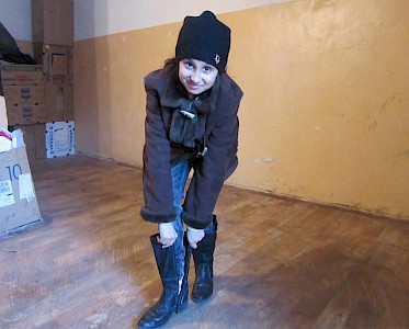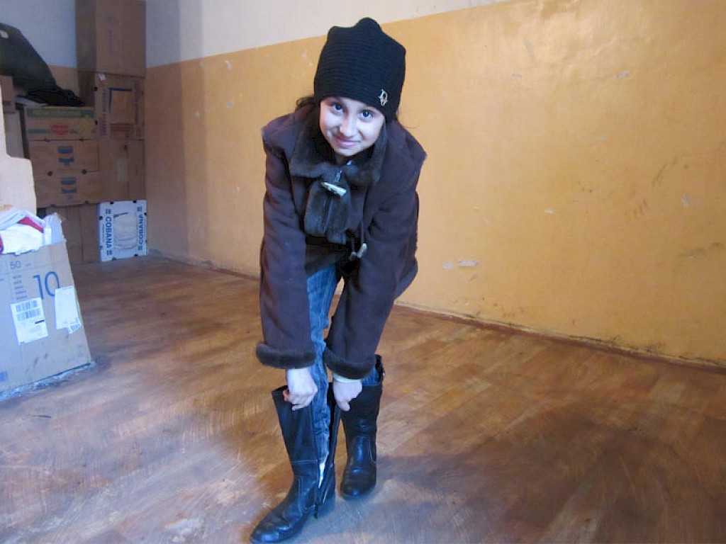 Es dauert nicht lang und wir haben Schuhe, Kleidung und trockene Strümpfe für Alina gefunden und sie kann mit den anderen Kindern spielen.