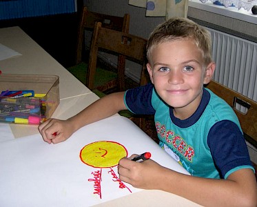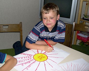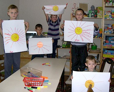 Heute hat Lena Uchnal eine große Sonne aufgemalt, die jeder abmalen soll. Auf jeden Sonnenstrahl müssen die Kinder ihre Gaben und Talente, ihr Fähigkeiten und Qualifikationen schreiben. Es ist wichtig zu erkennen, was man gut kann. Das stärkt unser Selbstwertgefühl.