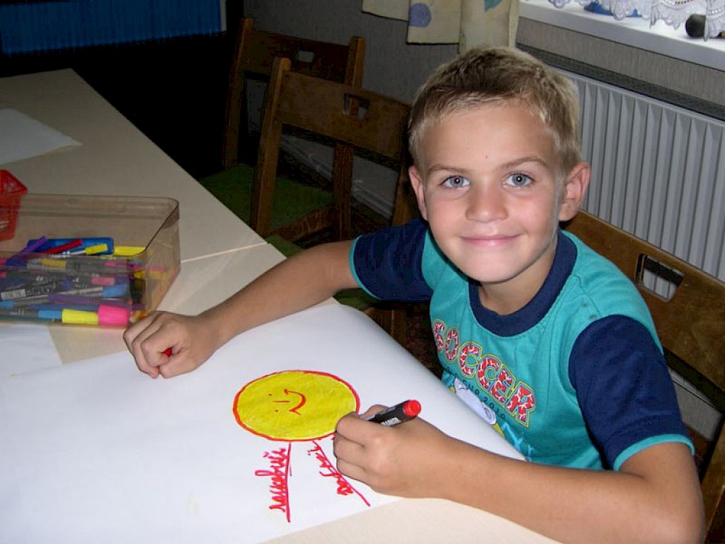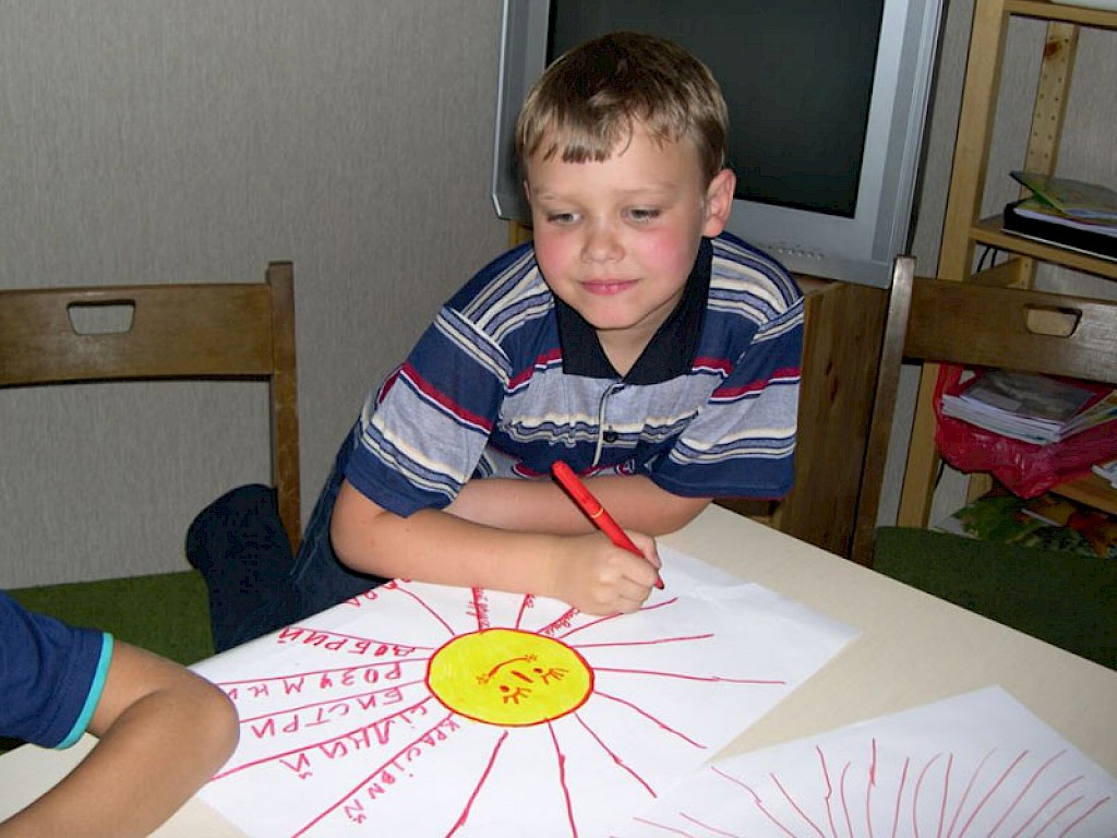 Heute hat Lena Uchnal eine große Sonne aufgemalt, die jeder abmalen soll. Auf jeden Sonnenstrahl müssen die Kinder ihre Gaben und Talente, ihr Fähigkeiten und Qualifikationen schreiben. Es ist wichtig zu erkennen, was man gut kann. Das stärkt unser Selbstwertgefühl.