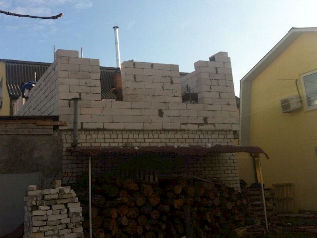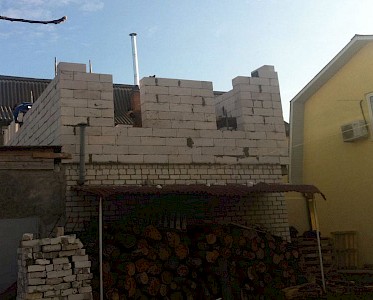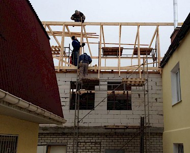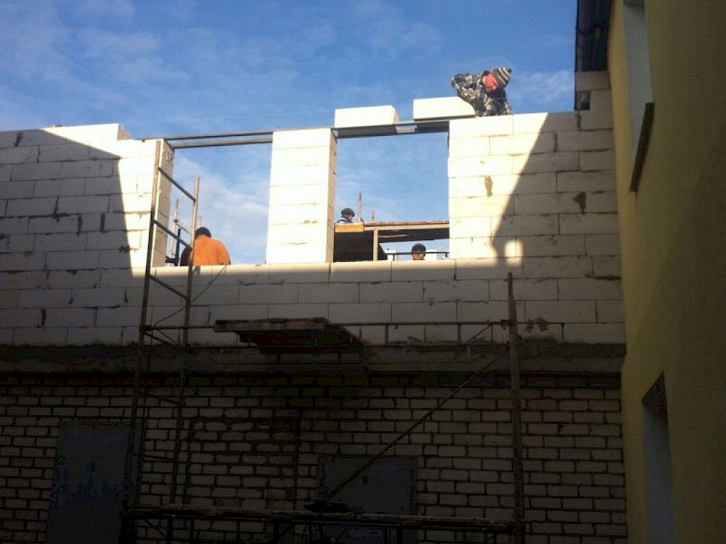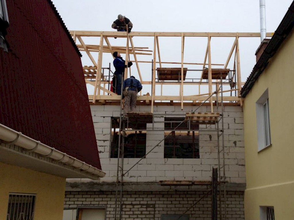 Das zweite Stockwerk wurde bereits gemauert. Nun arbeitet unsere Brigade daran das neue Dach mit dem alten Dach zu verbinden.