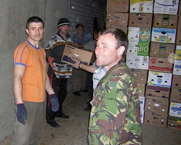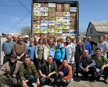Neugierig stehen Nachbarn am Gartenzaum, beobachten wie unser 34 Tonnen LKW über die löchrige Straße zu unserer „Villa Sonnenschein“ holpert. Müde steigen die beiden LKW Fahrer, Dima Grabenko und Peter Degtjar, aus. Hinter ihnen liegen fast 6.000 Kilometer.