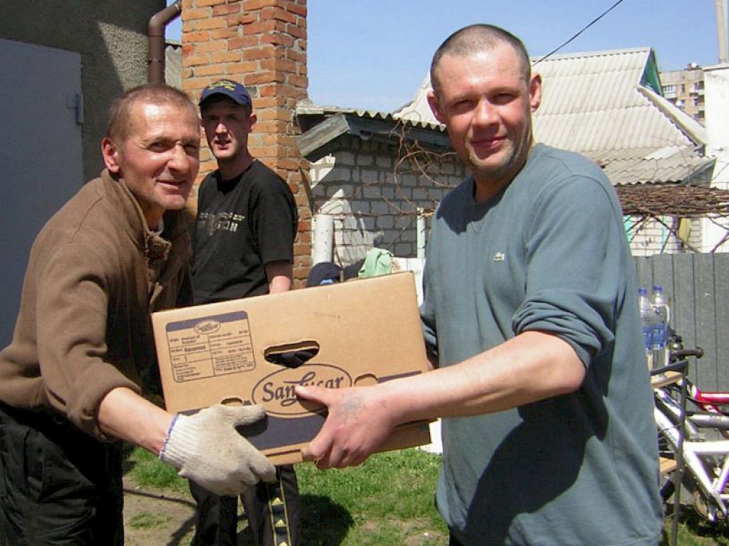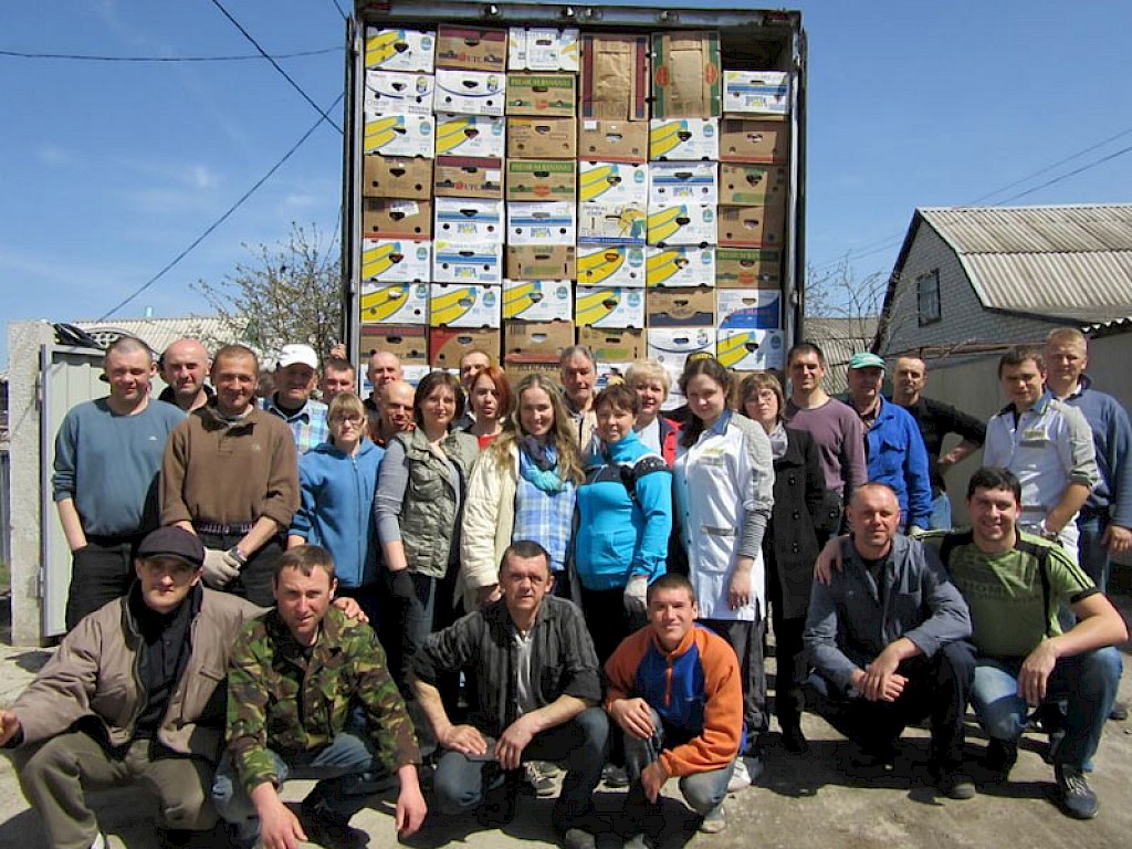Neugierig stehen Nachbarn am Gartenzaum, beobachten wie unser 34 Tonnen LKW über die löchrige Straße zu unserer „Villa Sonnenschein“ holpert. Müde steigen die beiden LKW Fahrer, Dima Grabenko und Peter Degtjar, aus. Hinter ihnen liegen fast 6.000 Kilometer.