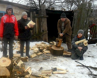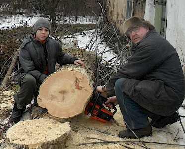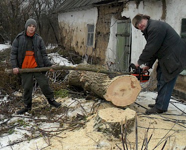 Nachdem vor einer Woche ihre Brennholzvorräte, die wir ihnen angelegt haben, zu Ende gingen, machte sich Peter Degtjar mit seinen Kindern auf den Weg, um den Beiden genug Brennholz für den restlichen Winter zu schenken.