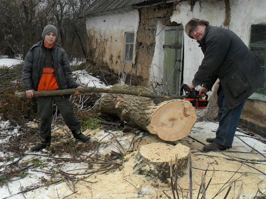 Nachdem vor einer Woche ihre Brennholzvorräte, die wir ihnen angelegt haben, zu Ende gingen, machte sich Peter Degtjar mit seinen Kindern auf den Weg, um den Beiden genug Brennholz für den restlichen Winter zu schenken.