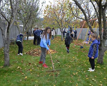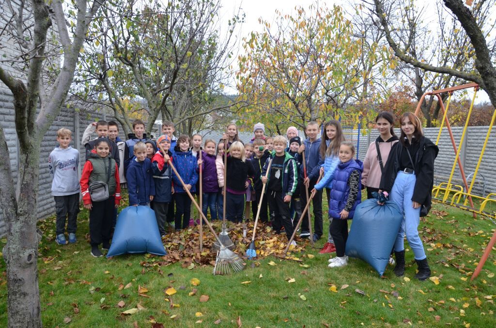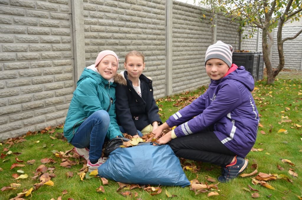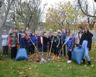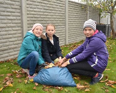 Unzählige bunte Blätter liegen auf dem Gras. Es ist Zeit zum Aufräumen. Die Kinder schnappen sich die Rechen und rennen in den Garten. Einige von ihnen heben die Blätter mit den Händen auf, andere harken sie auf einen Haufen und füllen sie in Säcke, die sie dann kompostieren. Andere binden farbenfrohe Kränze aus den Blättern und schmücken sich damit.