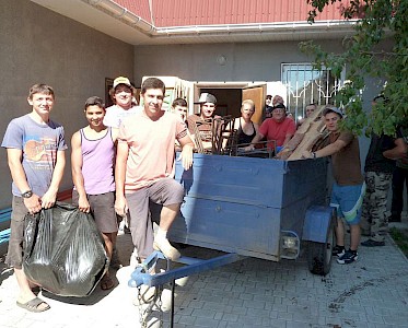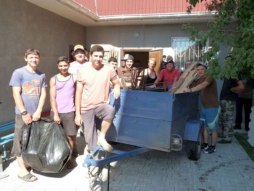 Ein Fahrzeug nach dem anderen wird geladen, Gefriertruhen, Gasöfen, Zelte, Küchenmöbel, Lebensmittel, Getränke, Sportmaterial, es scheint kein Ende zu nehmen. Zur Mittagszeit ist alles bereits am Strand des Dnepr Flusses abgeladen.