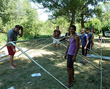 Spät am Abend können wir uns kaum noch bewegen. Alle Knochen schmerzen, aber wir sind froh, dass wir am ersten Tag schon so viel geschafft haben. Vor uns liegen noch zwei arbeitsreiche Tage, bevor unsere Gäste staunend vor unserem „Sommerlager 2014“ stehen.