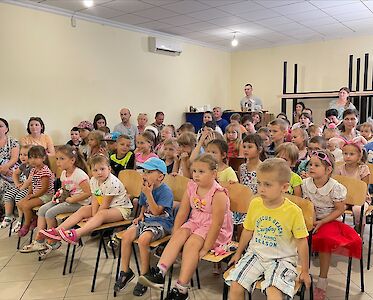 Die Aula ist gefüllt mit Kindern, die mit ihren Eltern vor dem Krieg geflohen sind. Viele von ihnen leben auf dem Boden von Turnhallen, in Schulen oder Kindergärten. Sie sind gespannt, was sie jetzt gleich erleben werden.