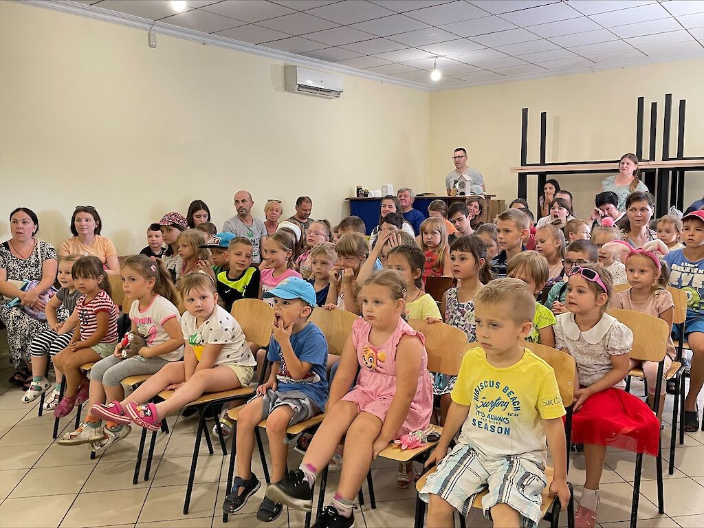 Die Aula ist gefüllt mit Kindern, die mit ihren Eltern vor dem Krieg geflohen sind. Viele von ihnen leben auf dem Boden von Turnhallen, in Schulen oder Kindergärten. Sie sind gespannt, was sie jetzt gleich erleben werden.
