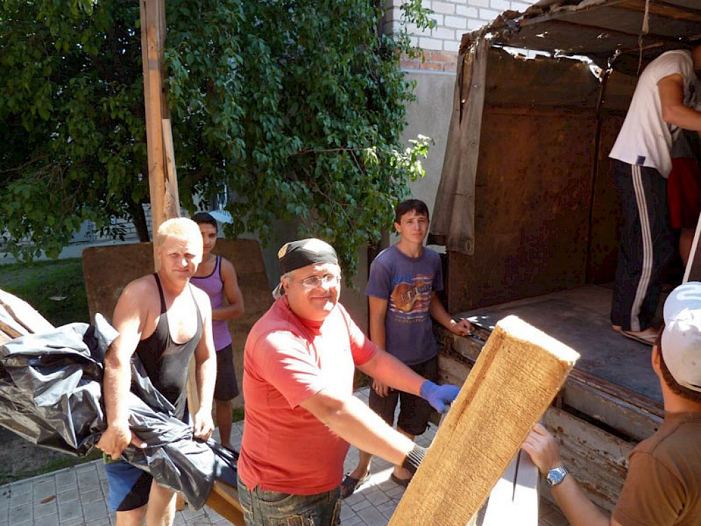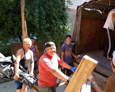 Viele Helfer sind aus den Gemeinden in Swetlowodsk gekommen, um sich für die aufopfernde Arbeit unserer Mitarbeiter zu bedanken, um zu helfen das ganze Material wieder nach Swetlowodsk zu transportieren.