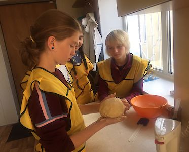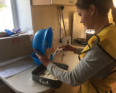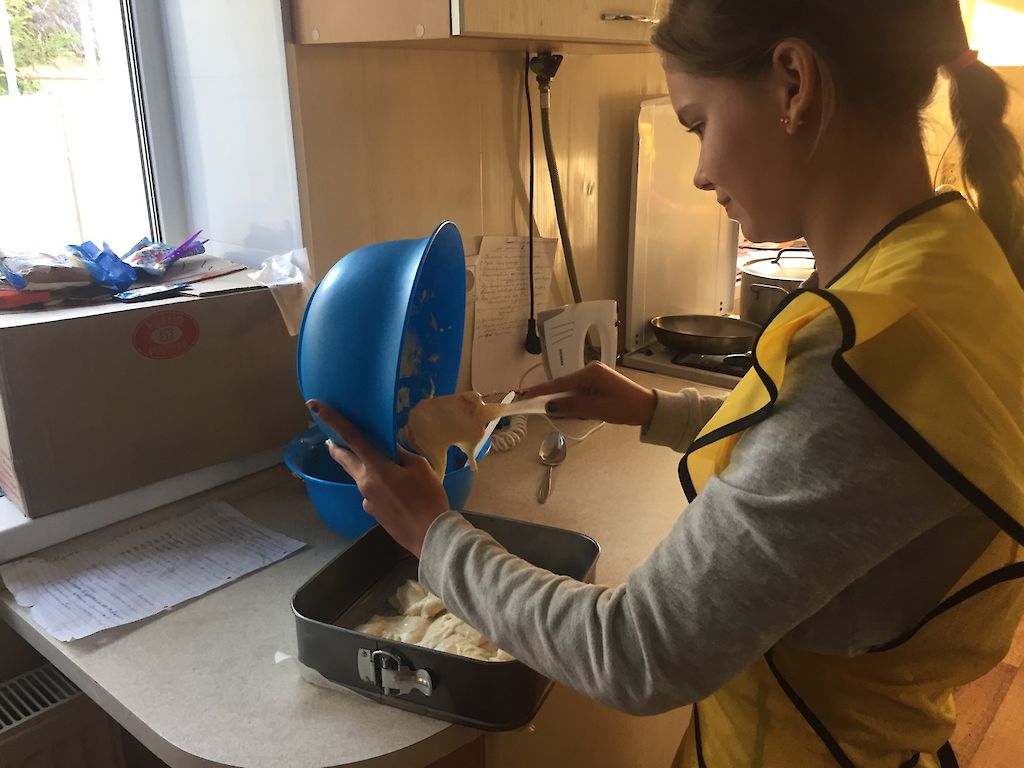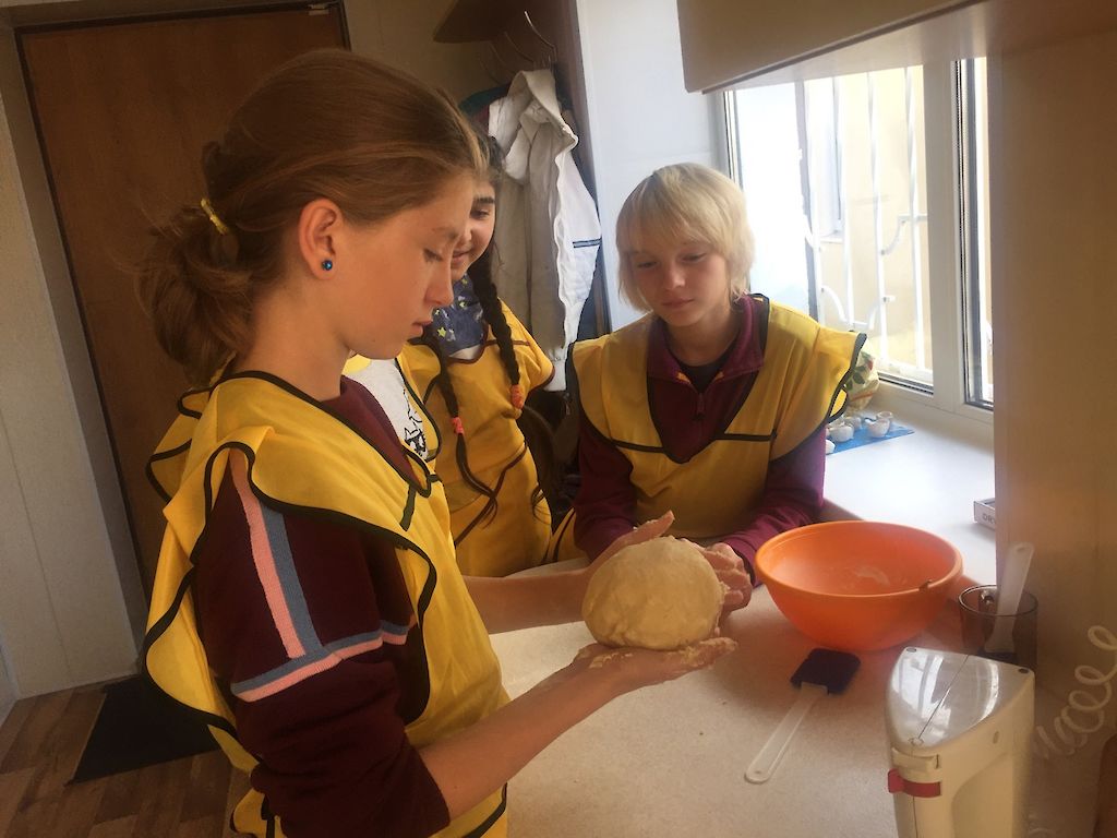 „200 Gramm Zucker, vier Eier zu Schaum geschlagen…“ Lilia macht sich vorsichtig an die Arbeit. Neben ihrem Gefäß liegt ein aufgeschlagenes Kochbuch. Diana und Ramina haben lustiges Schürzen an und sind mit anderen Zutaten beschäftigt. Herzlich willkommen im Backstudio im „Zufluchtsort“ in Pawlowka!