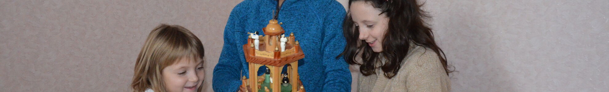 „Schau mal, da ist die Weihnachtspyramide!“ „So viele bunte Kugeln. Das wir ein festlich geschmückter Baum!“ Die Jungen und Mädchen sind mit Eifer bei der Sache.