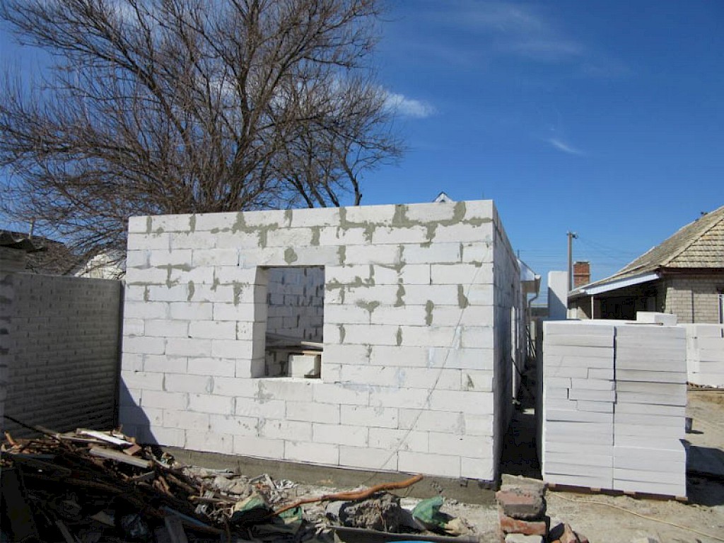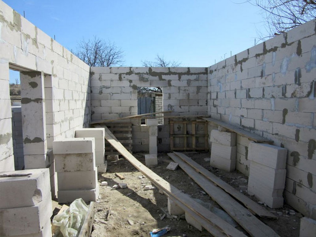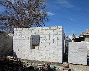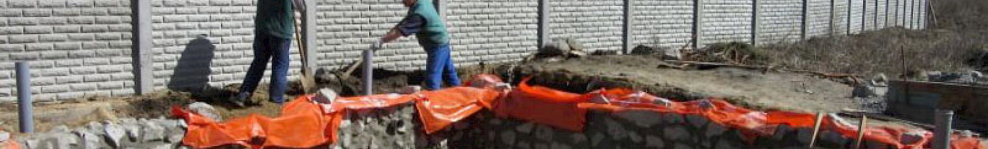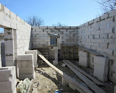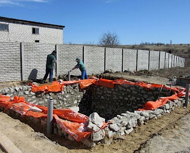 Die Bauarbeiten in Pawlowka machen weitere Fortschritte. Die Außenwände vom Schlafhaus der Jungen sind fertig gemauert. Sie warten nun auf ein Dach. Doch in diesem Arbeitsbereich wird erst einmal eine Pause eingelegt, da alle Arbeiter mit dem unterirdischen Vorratsraum beschäftigt sind.