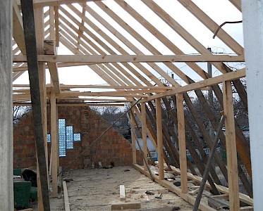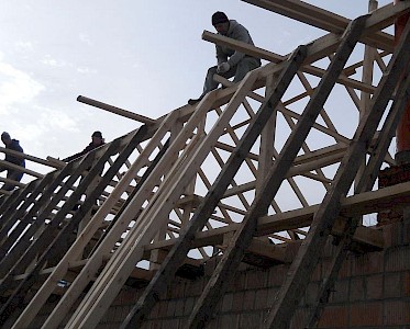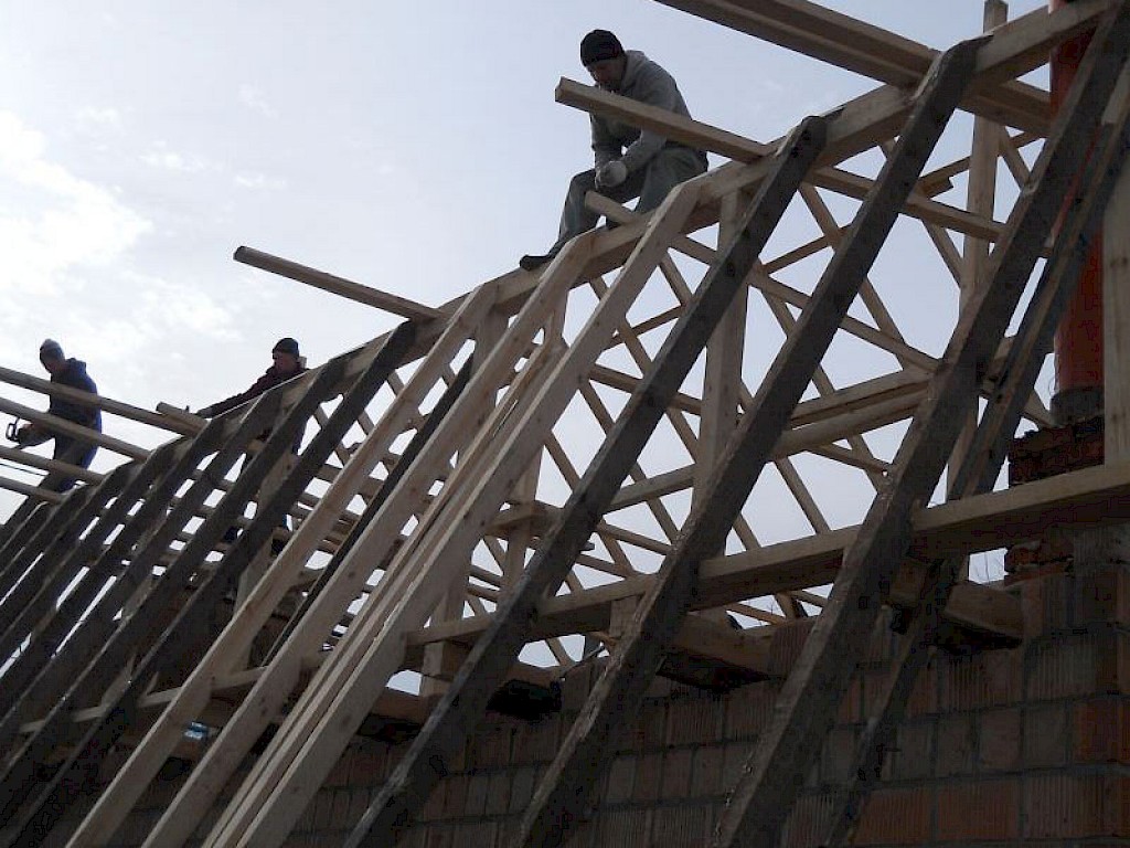 In der vergangenen Woche wurde das Dach abgedeckt. Es soll höher gelegt werden, denn im zweiten Stockwerk soll ein großer Versammlungsraum für Veranstaltungen entstehen. Die Arbeiter arbeiten momentan sechs Tage die Woche, da es in diesen Tagen noch oft regnet und das Dach so schnell wie möglich geschlossen werden musste.