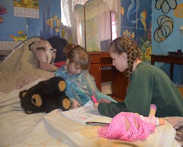 „Heute habe ich Tanja getroffen. Sie war verzweifelt, ihr Mann kämpft im Krieg. Die Kinder waren sehr krank und Tanja hat ihr ganzes Geld für Medikamente ausgegeben. Für Lebensmittel ist kein Geld übrig“, berichtet Karina. Gemeinsam überlegen die Mädchen, wie sie Tanja helfen können, besuchen die Frau und beten zusammen.