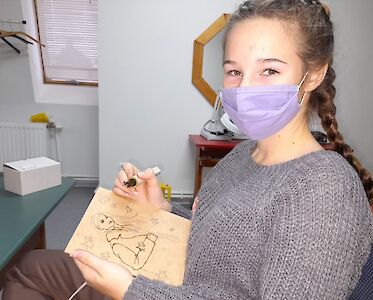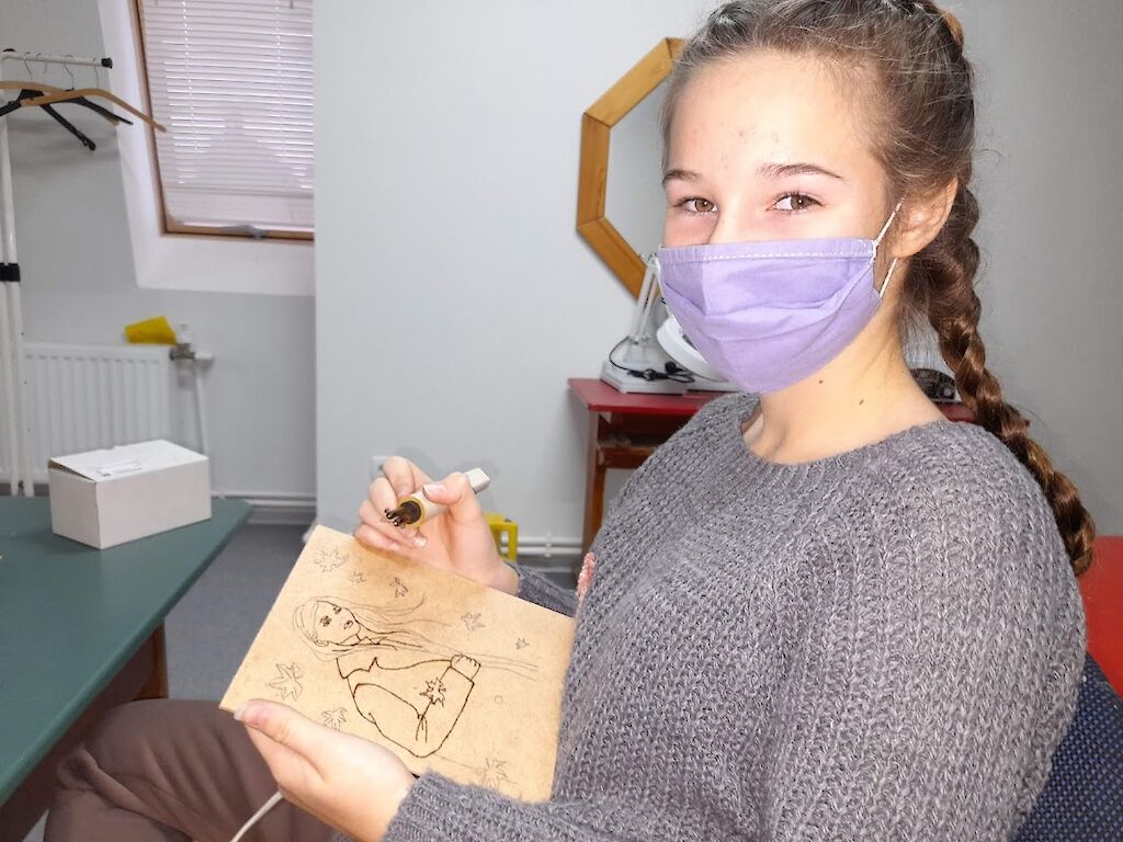 Am Anfang muss man erst einmal das Werkzeug kennenlernen, um sich nicht zu verbrennen. Aliona Raschkowa, die unsere „Villa Regenbogen“ leitet, weist die Neulinge ein. Die Technik ist nicht so einfach. Einige ärgern sich, wenn sie kleine Fehler machen, da man sie kaum korrigieren kann.