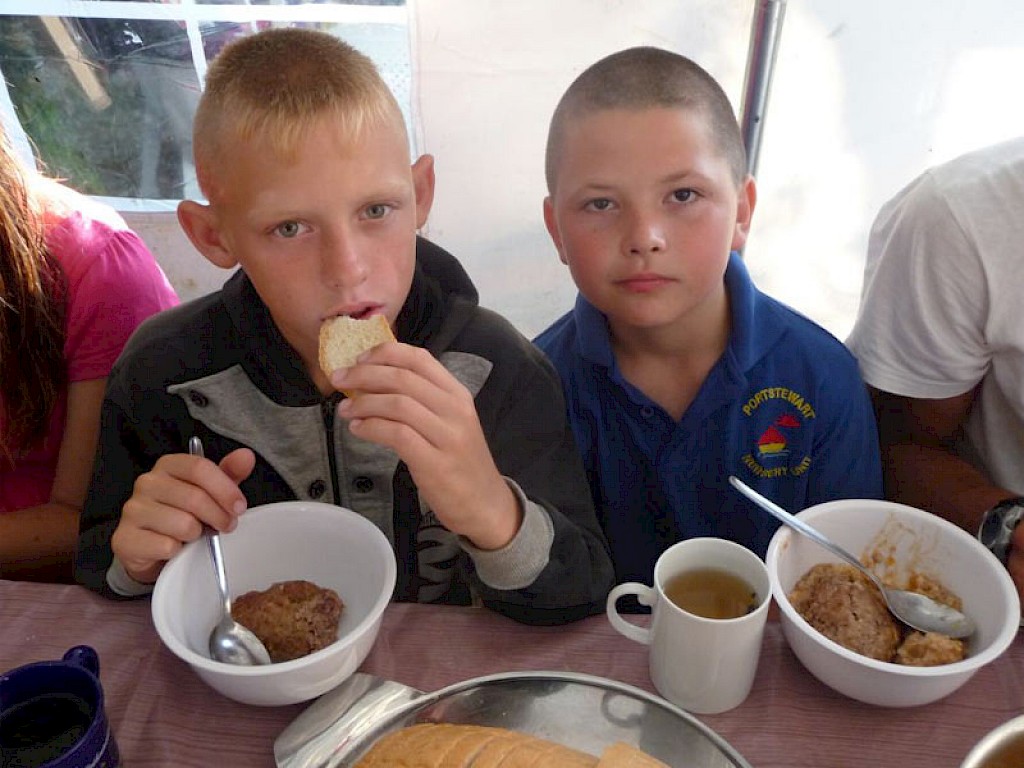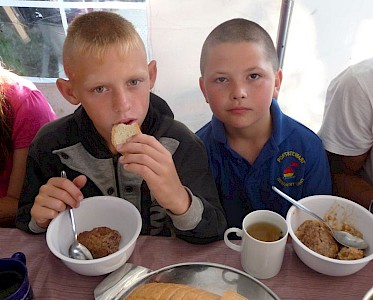 „Wow! Sind das echte Frikadellen? Die sind ja riesig!“ – freut sich Bogdan über die köstlichen Kochkünste unseres Küchenteams. Er kommt aus einer sehr armen Familie. Sein Vater hat in der Wirtschaftskrise seine Arbeit verloren. Im Sommerlager kann er sich endlich wieder einmal satt essen und die leckeren Frikadellen machen ihn richtig glücklich.