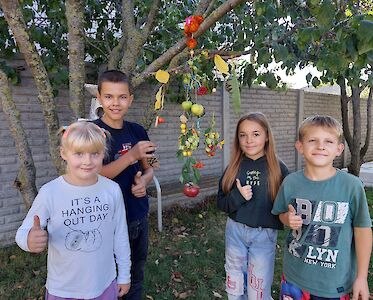 Gott sei Dank war der Alarm schnell zu Ende, die Bedrohung war vorbei. Zurück in Villa Sonnenschein gab es Tee und leckere Kekse. Anschließend bastelten alle zusammen Herbstdekorationen für die Bäume im Garten. Der Fantasie waren keine Grenzen gesetzt und bald wiegten sich die farbenfrohen Kunstwerke im Wind. Und die Sirene heulte schon wieder los…