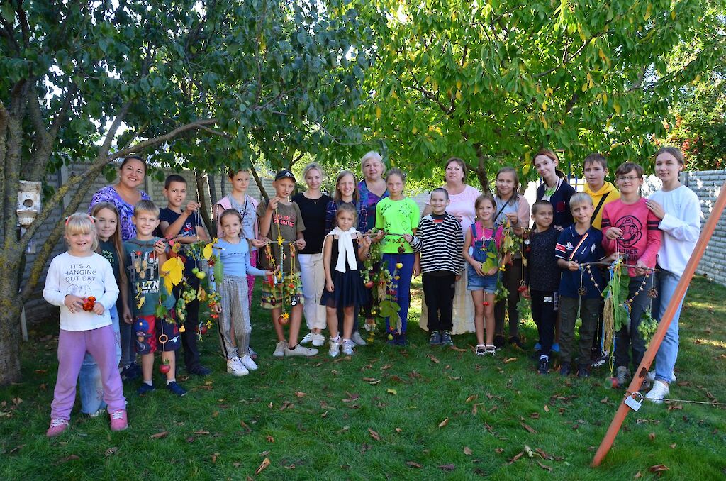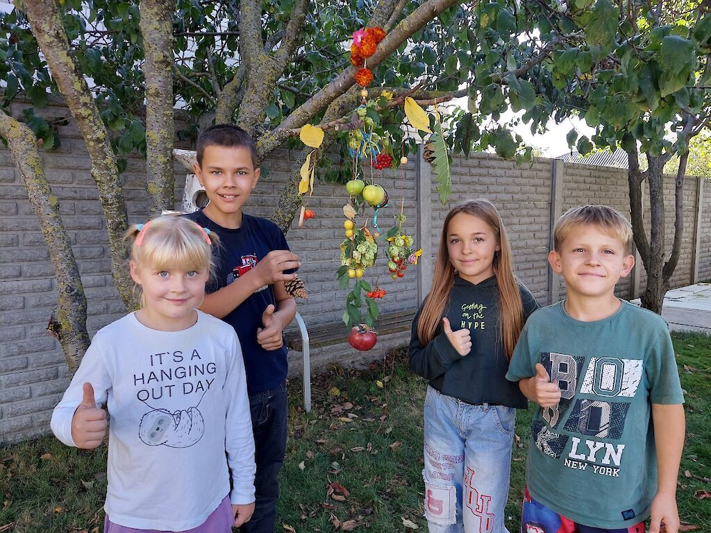 Gott sei Dank war der Alarm schnell zu Ende, die Bedrohung war vorbei. Zurück in Villa Sonnenschein gab es Tee und leckere Kekse. Anschließend bastelten alle zusammen Herbstdekorationen für die Bäume im Garten. Der Fantasie waren keine Grenzen gesetzt und bald wiegten sich die farbenfrohen Kunstwerke im Wind. Und die Sirene heulte schon wieder los…
