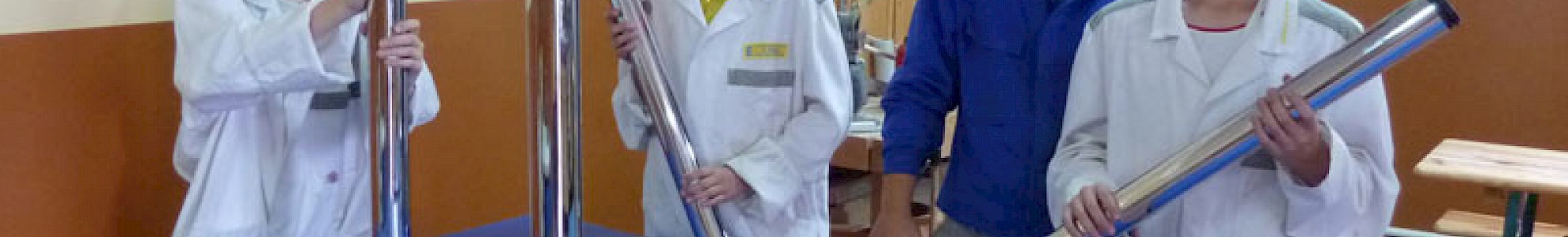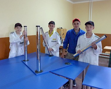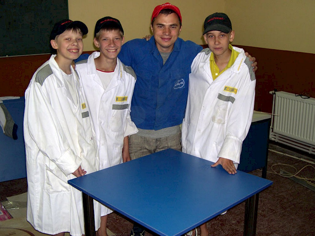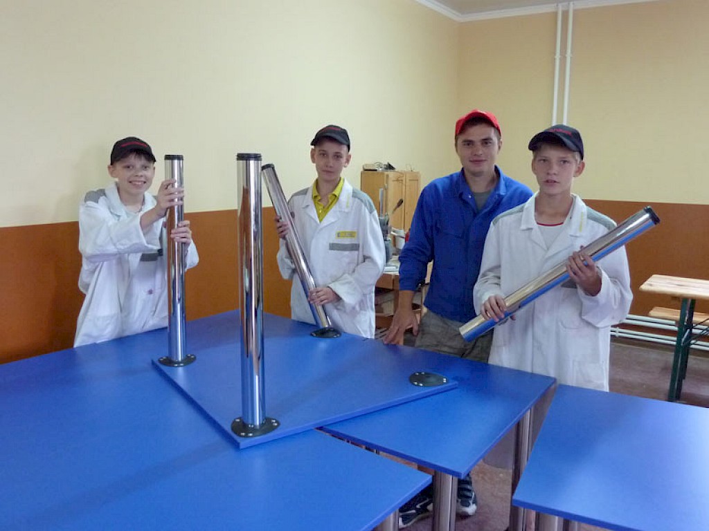 In den vergangenen Tagen ließen wir Tischplatten in einer Schreinerei bauen, an die unsere „Lehrlinge“ Beine schraubten. Ein ehrenamtlicher Helfer baut uns nun für diesen Raum 25 Stühle zum Materialpreis.