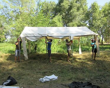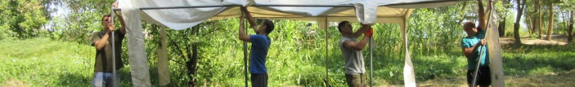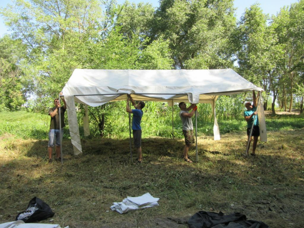 Am Montag ist er endlich da, der langersehnte Tag, In aller Frühe werden unsere Fahrzeuge von vielen ehrenamtlichen Helfern geladen und um 7:00 Uhr machen wird uns auf den Weg zu unserem Lagerplatz. In den kommenden Stunden wird ein Zelt nach dem anderen am Ufer des Dnepr aufgebaut.