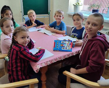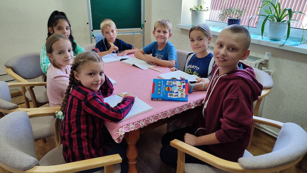 Während der Luftangriffe langweilen sich viele Jungen und Mädchen in den Schutzräumen. Aber beim Lesen von Büchern ist diese Zeit weniger eintönig! Viele Kinder leihen sich gerne Bücher bei Denis aus und lesen sie interessiert.