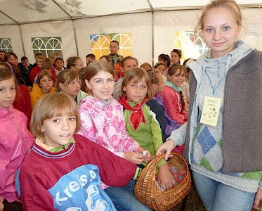 Graue Wolken treiben über den Dnepr Fluss. Nach vielen heißen Tagen kühlt es ein wenig ab. Da fallen auch schon die ersten Regentropfen. Es regnet den ganzen Tag und wir müssen unser Programm umstellen. In den Vorbereitungstreffen erklären wir allen Teilnehmern, dass ein Tag unter dem Motto läuft: Der geheimnisvolle Freund.