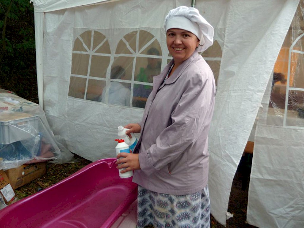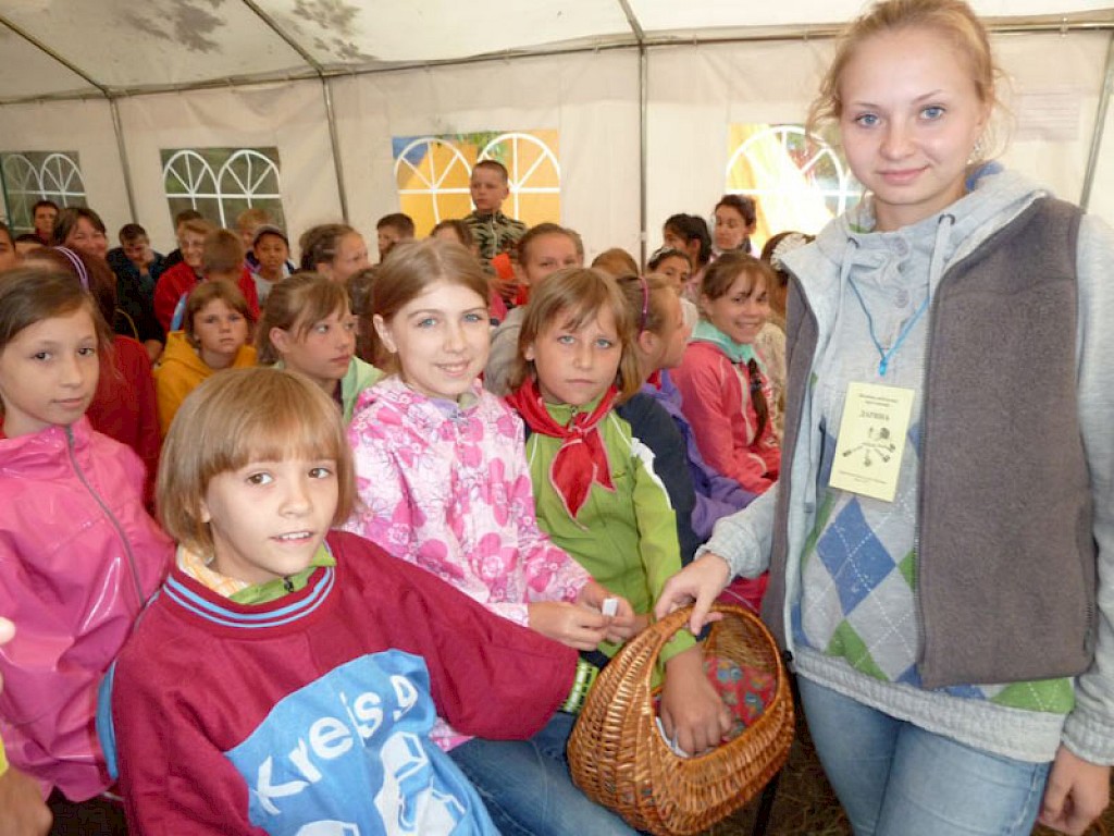 Graue Wolken treiben über den Dnepr Fluss. Nach vielen heißen Tagen kühlt es ein wenig ab. Da fallen auch schon die ersten Regentropfen. Es regnet den ganzen Tag und wir müssen unser Programm umstellen. In den Vorbereitungstreffen erklären wir allen Teilnehmern, dass ein Tag unter dem Motto läuft: Der geheimnisvolle Freund.