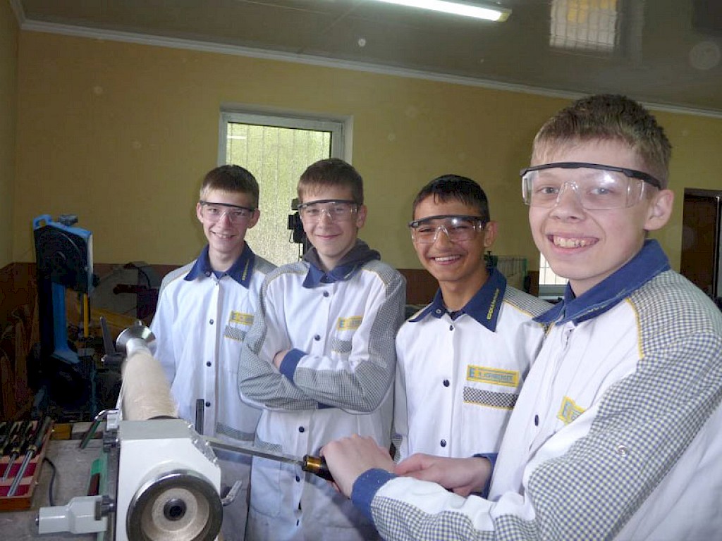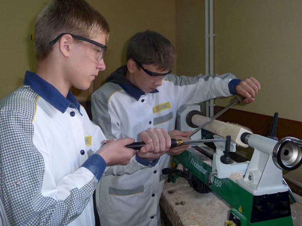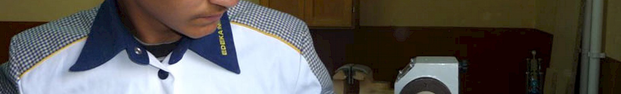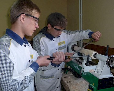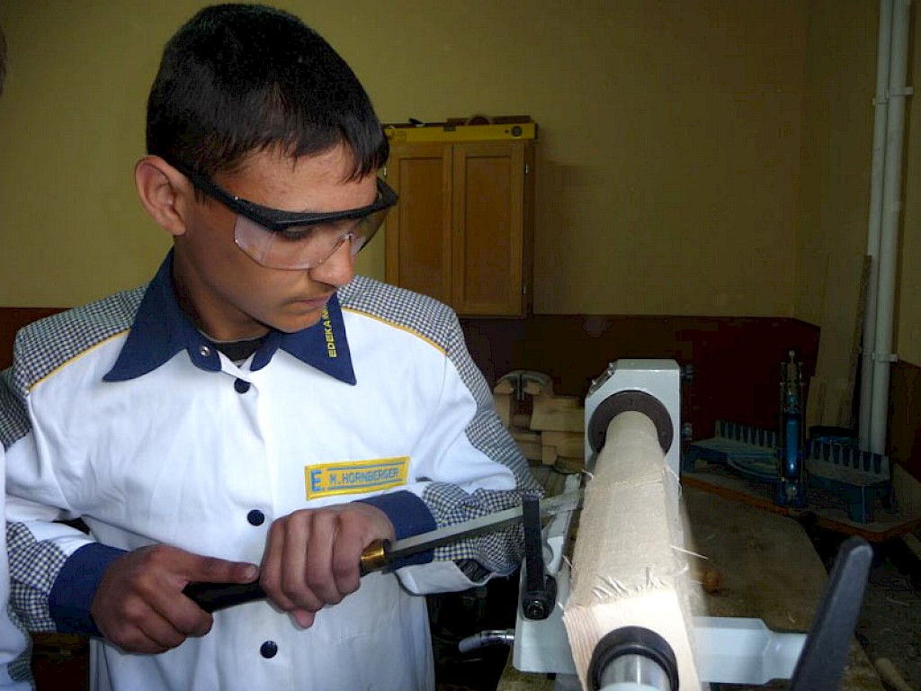 Vorsichtig spannt einer der Lehrlinge ein Stück Holz in die Maschine. Alle Jungen tragen Schutzbrillen. Die Sicherheitsmaßnahmen sind wichtig, das haben sie schon gelernt. Dann machen sie sich an die Arbeit. Ein Junge drückt den Startknopf, ein anderer bearbeitet das Holz.