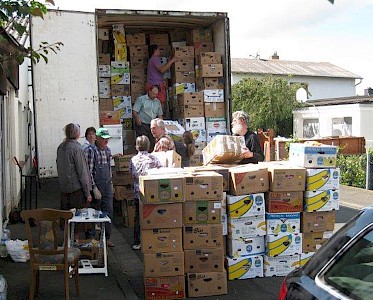 Langsam rangiert Dima Grabenko unseren 34 Tonnen LKW vor unserer Lagerhalle in Hüttenberg. Es ist nicht so leicht, ein so großes Fahrzeug aus der Ukraine nach Deutschland zu fahren und es in eine kleine Lücke einzuparken. Wieder einmal wird der Auflieger geladen, 97 Kubikmeter, 1.800 Bananenkartons.