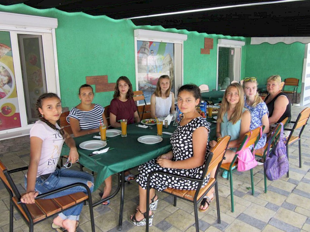 „Schau mal, da sind die Jungen in ihre Lehrwerkstatt eingezogen. Wir waren so neidisch auf sie. Und hier trafen die ersten Nähmaschinen aus Deutschland ein.“ Gleich am nächsten Tag lädt Lena Grabenko ihre Mädels in eine Pizzeria ein. Gemeinsam stöbern sie in unseren Fotos.