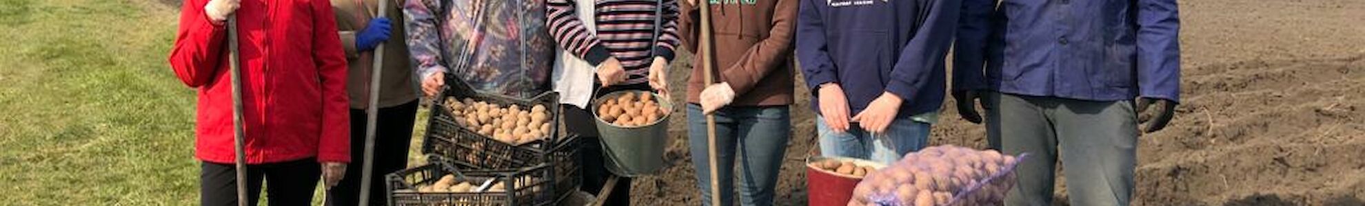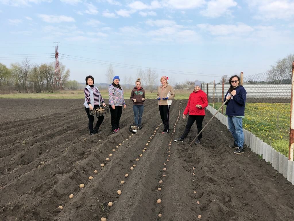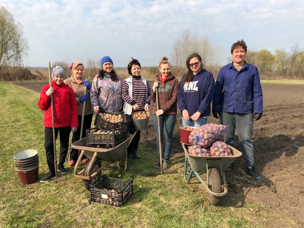 In der vergangenen Woche haben wir diesen Acker umgepflügt und haben vier LKW Ladungen mit Dünger auf dem Land verteilt. Danach haben einige starke Mitarbeiterinnen zusammen mit Dima Grabenko Kartoffeln in die Erde gelegt.