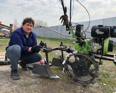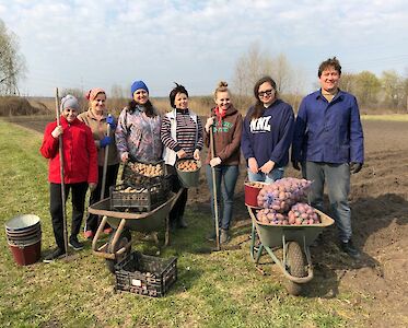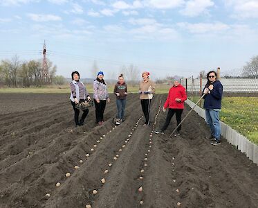 Luda Slobodianik leitet alle unsere Projekte, die etwas mit Hilfsgütern, mit Kartoffeln, mit Gemüse zu tun haben. Luda wohnt in einem kleinen Dorf gleich neben Swetlowodsk. Ihre Familie hat uns einen großen Acker hinter ihrem Haus zur Verfügung gestellt.