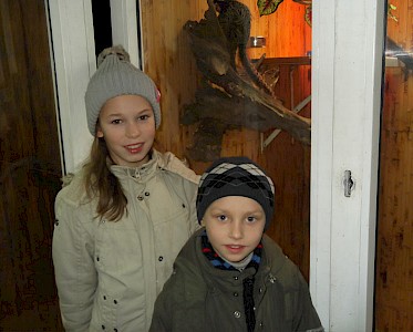 Ganz aufgeregt standen unsere Jungen und Mädchen vor dem Käfig mit einem Krokodil. Doch die Hauptattraktionen waren natürlich die lustigen Affen und der bunte Papagei der einige Worte sprechen konnte,