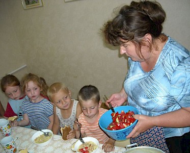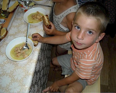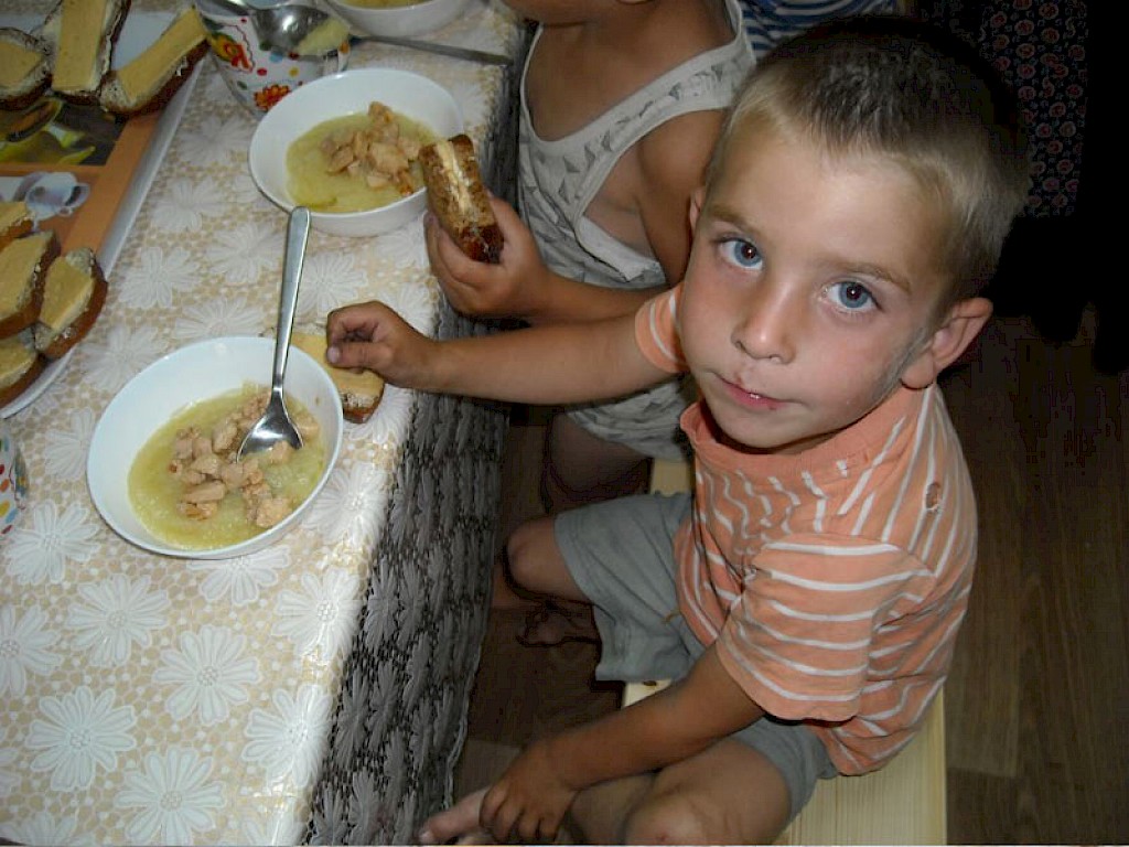 Der Speiseraum wird von einem verführerischen Duft erfüllt. Unsere kleinen Freunde können es kaum noch abwarten. Doch vorher müssen die Hände gewaschen werden. Ein Kind dankt im Gebet für die Menschen in Deutschland, die es ermöglichen, dass es jeden Tag etwas zu Essen gibt. Ein anderes Kind betet für das Essen.
