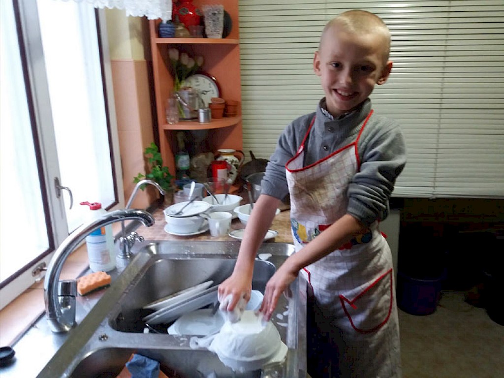 Oft kommt er fröhlich in die Küche von „Villa Sonnenschein“ um zu helfen. Dann wäscht er alles Geschirr ab und verstaut es in den Schränken. Wenn man den fröhlichen Jungen sieht, den wir alle ins Herz geschlossen haben, kann man sich kaum vorstellen, dass er aus einer kaputten Familie von Alkoholikern kommt.