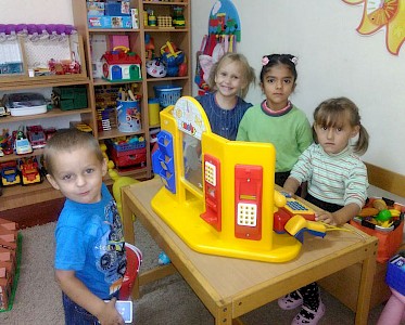 Andere stehen hinter dem Kaufladen, preisen mit lauter Stimme ihre Waren an. Zarina sitzt gemütlich in einer Ecke, blättert in einem Malbuch. Ein Anziehungsort ist die kleine Post. Die Jungen sind mit Autos beschäftigt. Herzlich willkommen in „Villa Sonnenschein“.