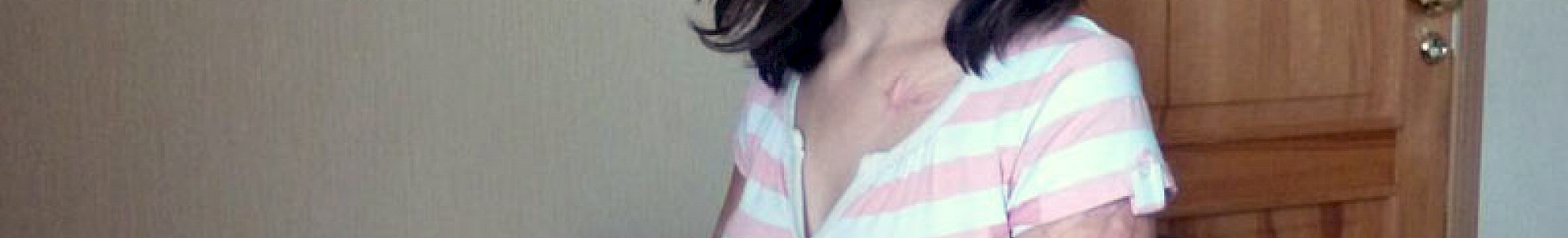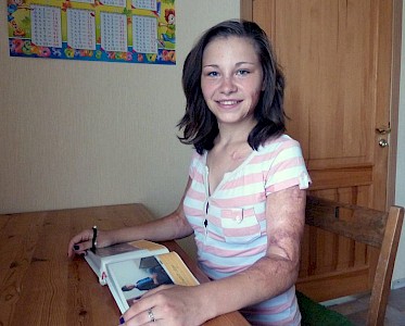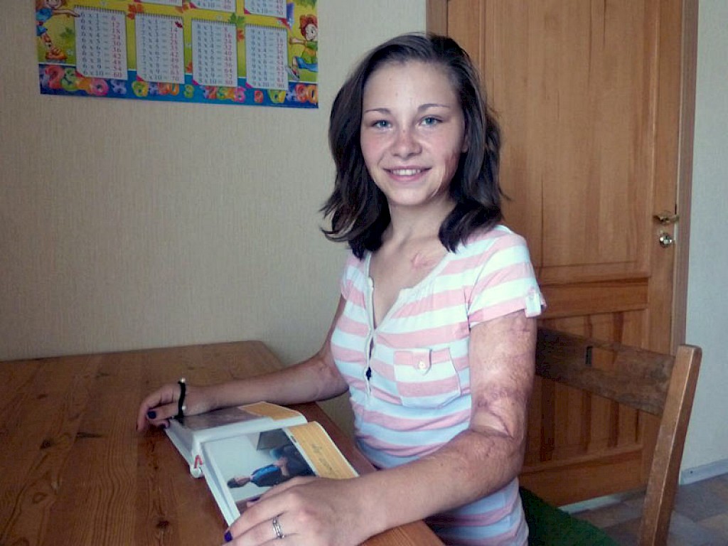 „Da bin ich noch ganz klein. Das war an meinem ersten Tag im „Spatzennest“!“ Wir können uns noch gut an den Tag erinnern, als sie von ihrer Mutter gebracht wurde, ihr Körper von schweren Verbrennungen entstellt. Im Februar ließen wir sie in Kiew operieren.