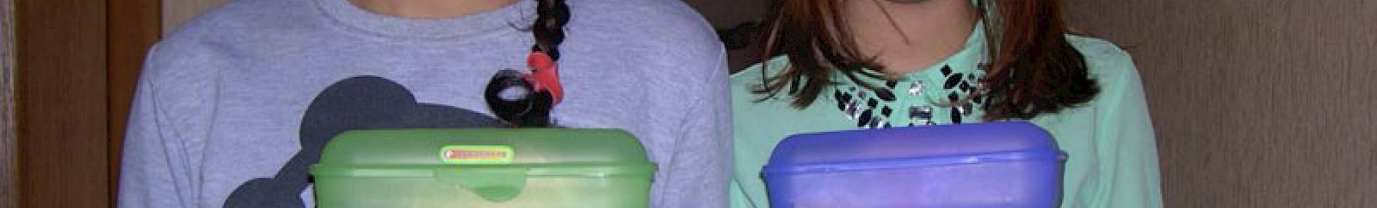 Natascha und Nastja, die dieses Programm leiten, haben wieder ein Abendessen für unsere Gäste vorbereitet. In der Box sind Käsebrote, ein Apfel, ein wenig Gemüse und zum Nachtisch ein großer Keks.