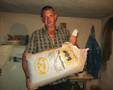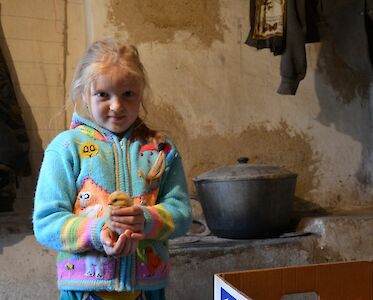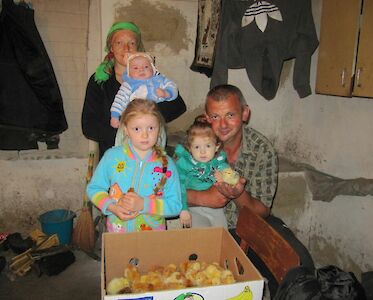 Luda Slobodianik leitet die Hilfsprogramme von „Brücke der Hoffnung“ in der Ukraine. Heute hat sie 100 Küken für Familie Ponomar auf einem Bauernmarkt gekauft. Katja, die Mutter der Familie, fällt es in diesen Tagen schwer, mit ihren fünf Kindern über die Runden zu kommen.