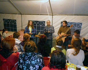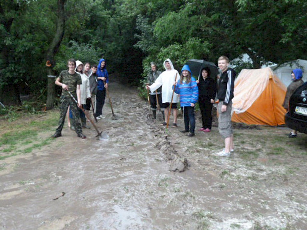Wild heult ein harter Sturm über unser Sommerlager am Dnepr Fluss. Tropf, tropf, tropf. Was tropft da auf mein Gesicht. Wie elektrisiert springe ich auf. Regen tropft auf mein Gesicht. Ich rase aus meinem Zelt. Regen strömt auf unser Lager. Plötzlich sehe ich, unser Materialzelt ist zusammengebrochen. In Panik renne ich von Zelt zu Zelt, versuche möglichst viele Helfer zu mobilisieren. In den kommenden Minuten schleppen wir nasse Schlafsäcke, Kartons mit Bastelmaterial zu unserem Küchenzelt, sinken nach einer Stunde erschöpft auf unsere Luftmatratzen zurück.