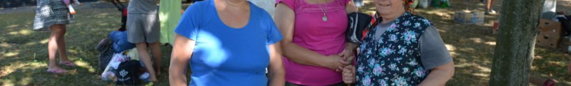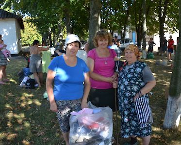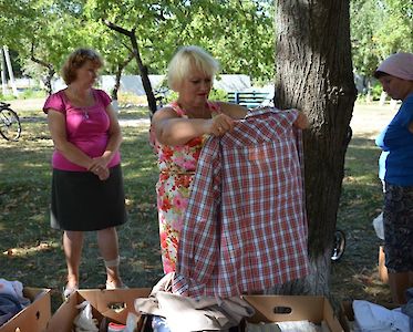 Für alle Dorfbewohner aus Andrusowka ist es immer ein Festtag, wenn wir sie mit Hilfsgütern besuchen, besonders, wenn der Winter vor der Tür steht. Neugierig durchstöbern sie alle Bananenkartons.