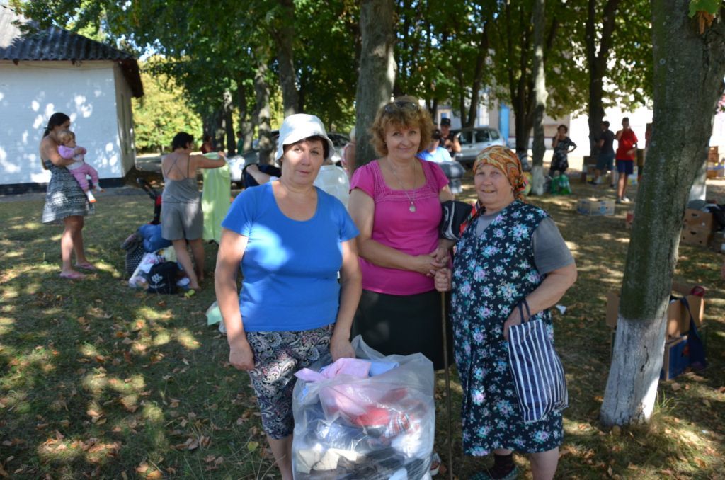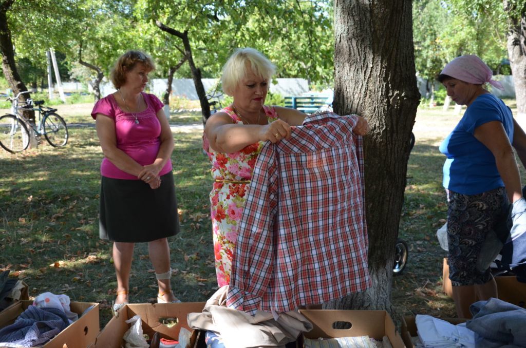 Für alle Dorfbewohner aus Andrusowka ist es immer ein Festtag, wenn wir sie mit Hilfsgütern besuchen, besonders, wenn der Winter vor der Tür steht. Neugierig durchstöbern sie alle Bananenkartons.