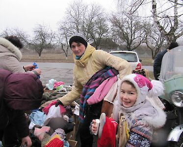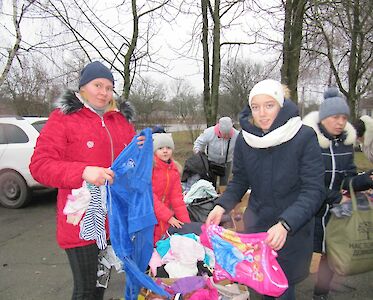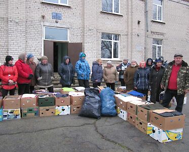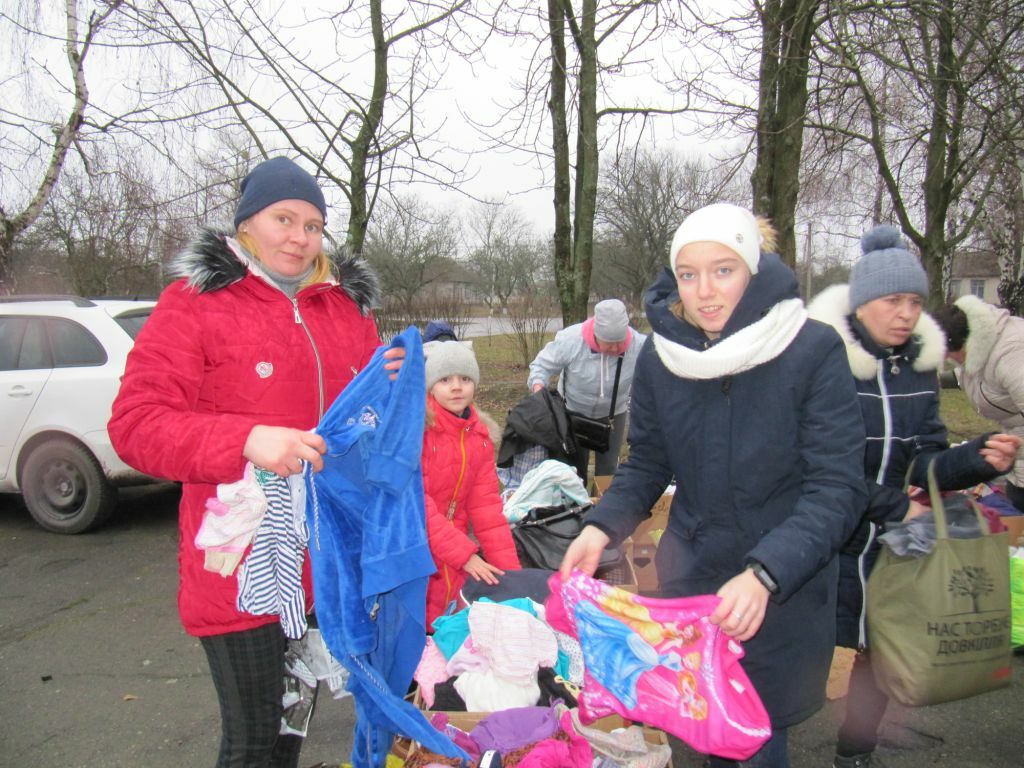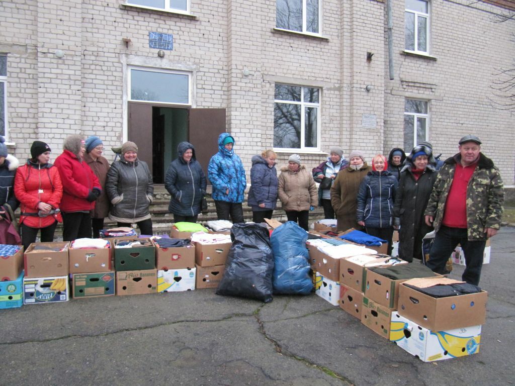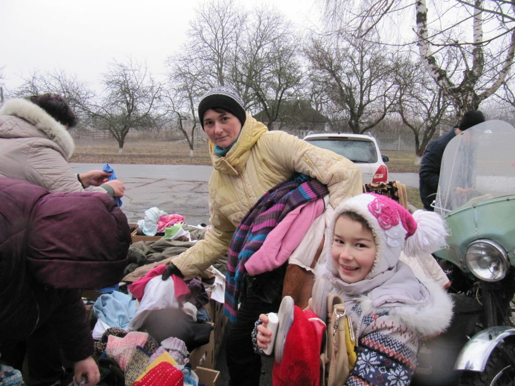 Dann geht es auch schon los. Die Dorfverwaltung hat die ärmsten Familien zu unserer Aktion eingeladen. Luda Slobodianik, die unsere Hilfsaktionen leitet, hält eine kleine Ansprache, erklärt, wie die Hilfsgüter aus Deutschland in ihr Dorf gelangt sind.