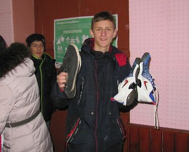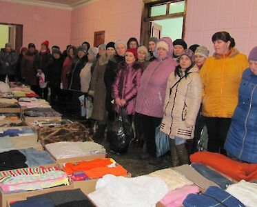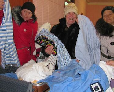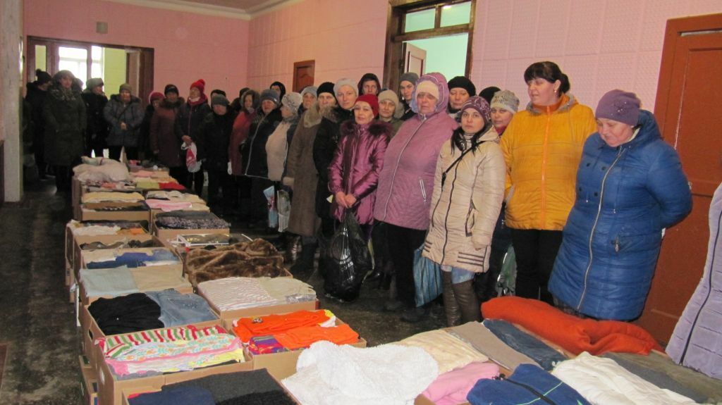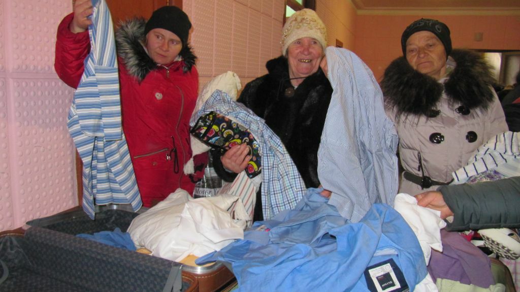„Sweta, schau dir mal diese wunderschöne Jacke an. Die passt bestimmt unserem Andrej und für meine älteren Jungen hab ich schon einige Pullover auf die Seite gelegt!“ Eifrig suchen Mütter aus all den Hilfsgütern aus Deutschland die richtige Kleidung für ihre Familie.