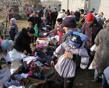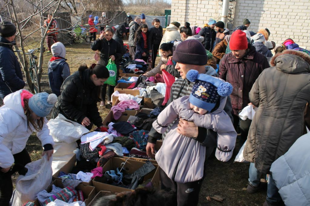 Vor uns steht eine Frau, die mit ihren fünf Kindern aus dem Kriegsgebiet in der östlichen Ukraine in dieses „Vergessene Dorf“ geflüchtet ist. Neben ihr steht ein Frau, die ihren Sohn, der bisher ihre Familie versorgt hat, zum Militär ins Kriegsgebiet ziehen lassen musste.