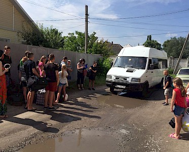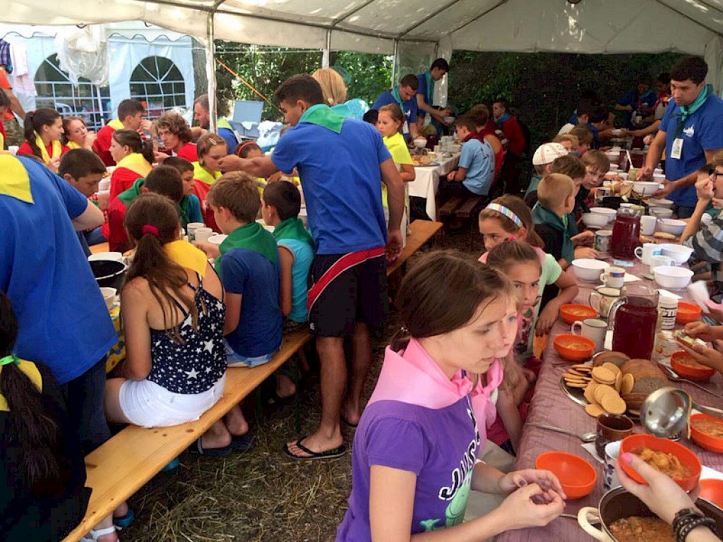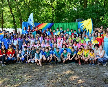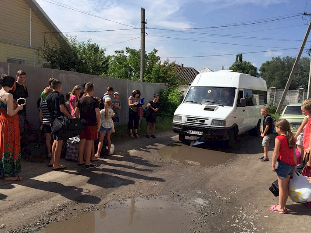 Endlich ist er da, der heißersehnte Tag. Bereits am Morgen sammeln sich aufgeregte Jungen und Mädchen vor „Villa Sonnenschein“. In zwei Bussen geht es Richtung Dnepr Fluss. Die Spannung steigt. Auf dem Weg begegnen wir Bussen aus Pawlowka, Grigorowka, Odarjewka und Boschedarjewka, alle auf dem Weg zum Sommerlager. Die Nasen an die Fensterscheiben gedrückt, erhaschen unsere Gäste erste Eindrücke von unserem Lagerplatz: „Herzlich willkommen zur Eröffnung unserer Gemäldegalerie! Lasst erst mal eure Taschen stehen, wir haben schon auf euch gewartet!“