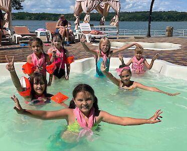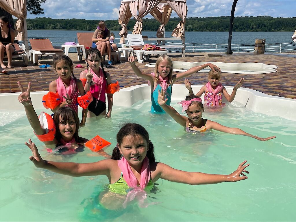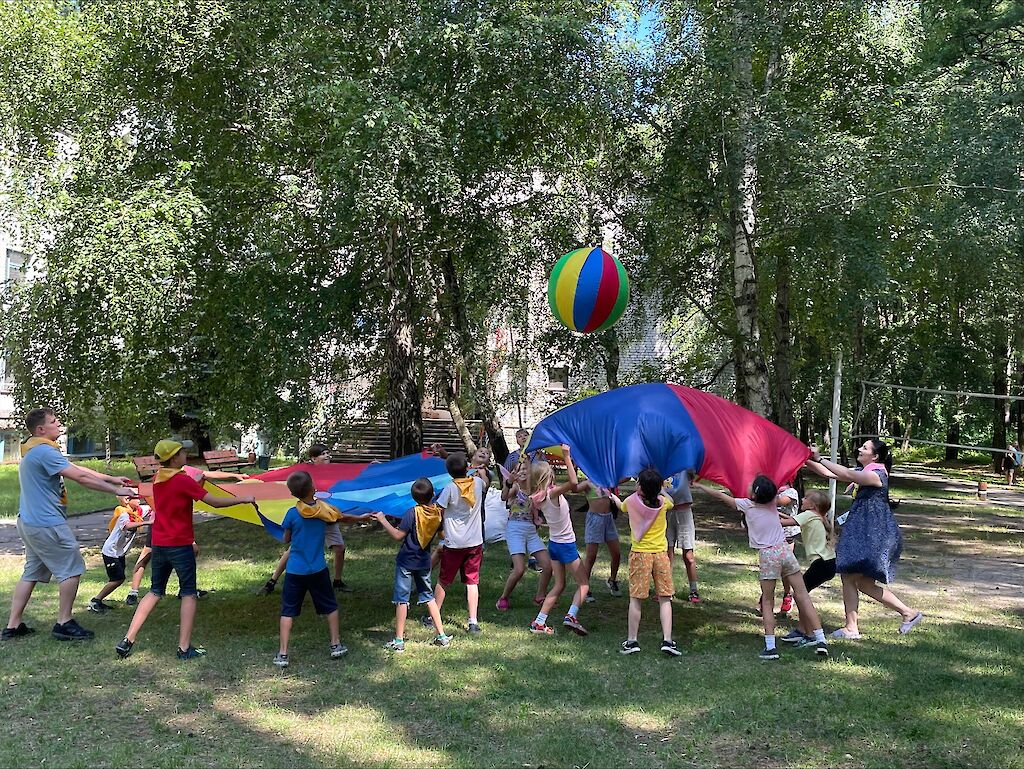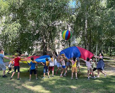 Dann kam die Entspannungszeit. Einige Gruppen malten, andere schwammen im Fluss. Besonders beliebt ist unsere Sportgruppe, das Spielen mit einem riesigen Ball, einem Fallschirm und anderem Sportmaterial.