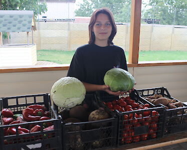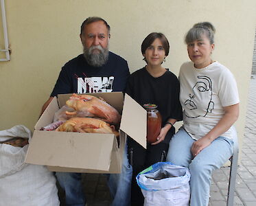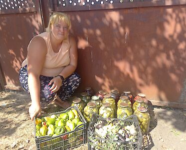 „Guten Tag! Mein Name ist Nadja. Ich komme aus Andrusiwka. Erinnern Sie sich, dass ich Sie im Frühjahr bat, mir beim Kauf von Saatgut und Gemüsesetzlingen zu helfen? Meine Familie ist sehr arm. Meine Kinder kann ich im Winter nur ernähren, wenn ich im Sommer hart auf dem Feld arbeite. Ich habe eine Menge Tomaten, Paprika und Gurken in meinem Garten, dank Ihrer Hilfe. Es war sehr heiß in diesem Jahr, aber wir konnten trotzdem ernten. Einen Teil davon möchte ich Ihnen abgeben. Ich weiß, dass Sie in Switlowodsk viele bedürftige Menschen unterstützen.“